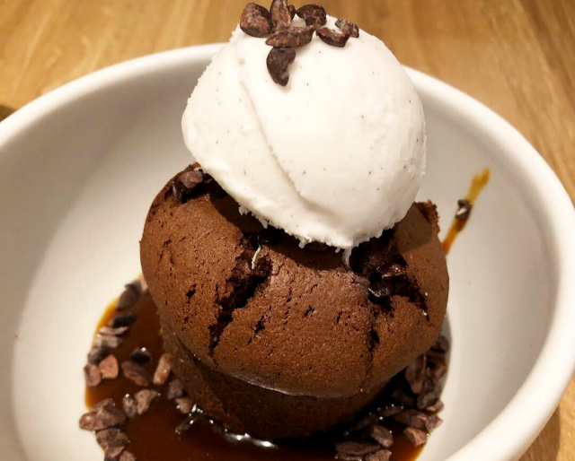 Dessert. I have to admit I’ve been eating less than half of an entree, bringing home leftovers so my favorite fella and I can split a dessert. We’ve been indulging in the Flourless Chocolate cake, topped with caramel sauce, almond, vanilla ice cream and a generous sprinkling of cacao nibs. It’s the perfect size to share after a plentiful meal.