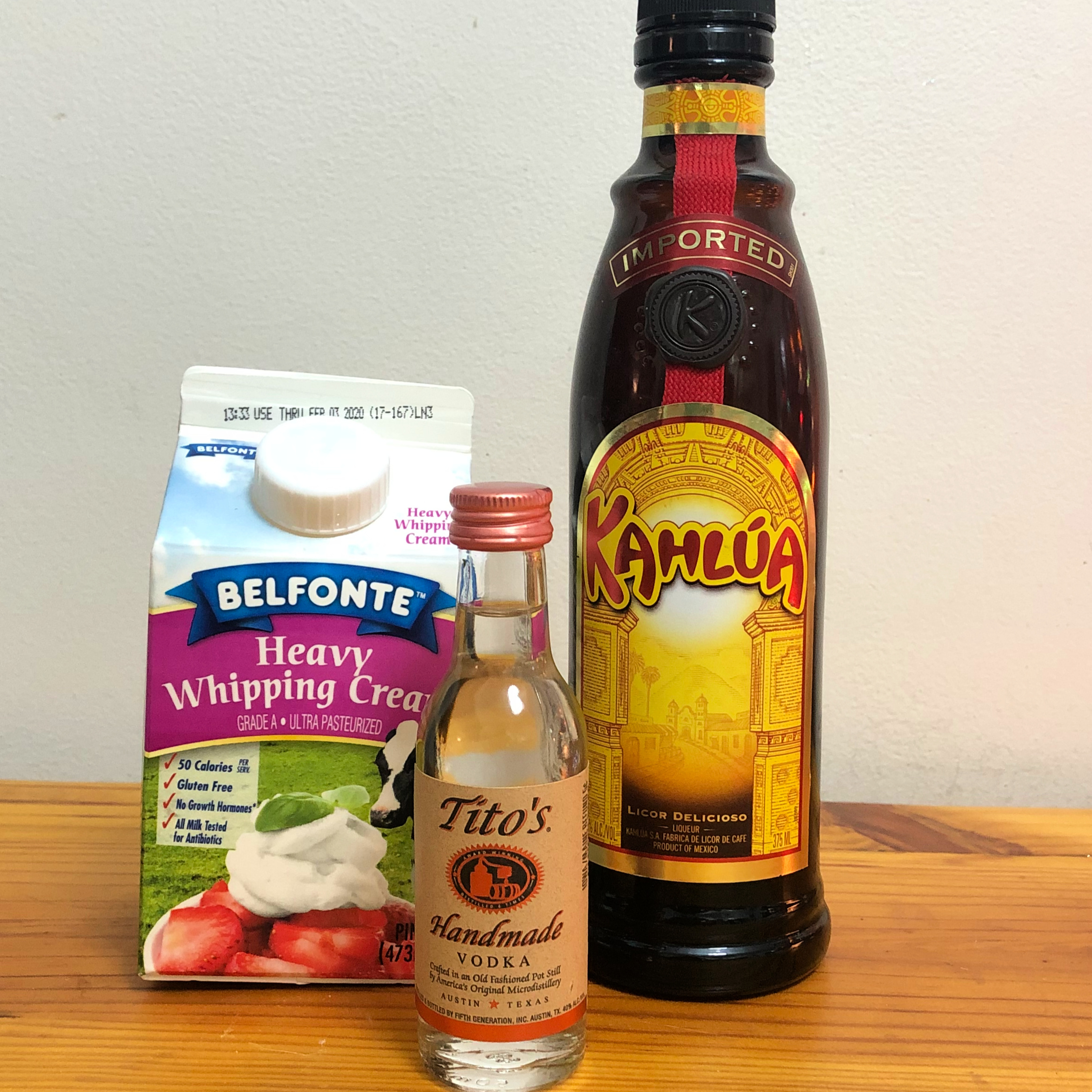 You’ll need only Kahlua, vodka and cream. Mix the kahlua and vodka together with ice, pour cream over the top. Could it get any easier? Just don’t spill it on the rug, it really ties the room together.