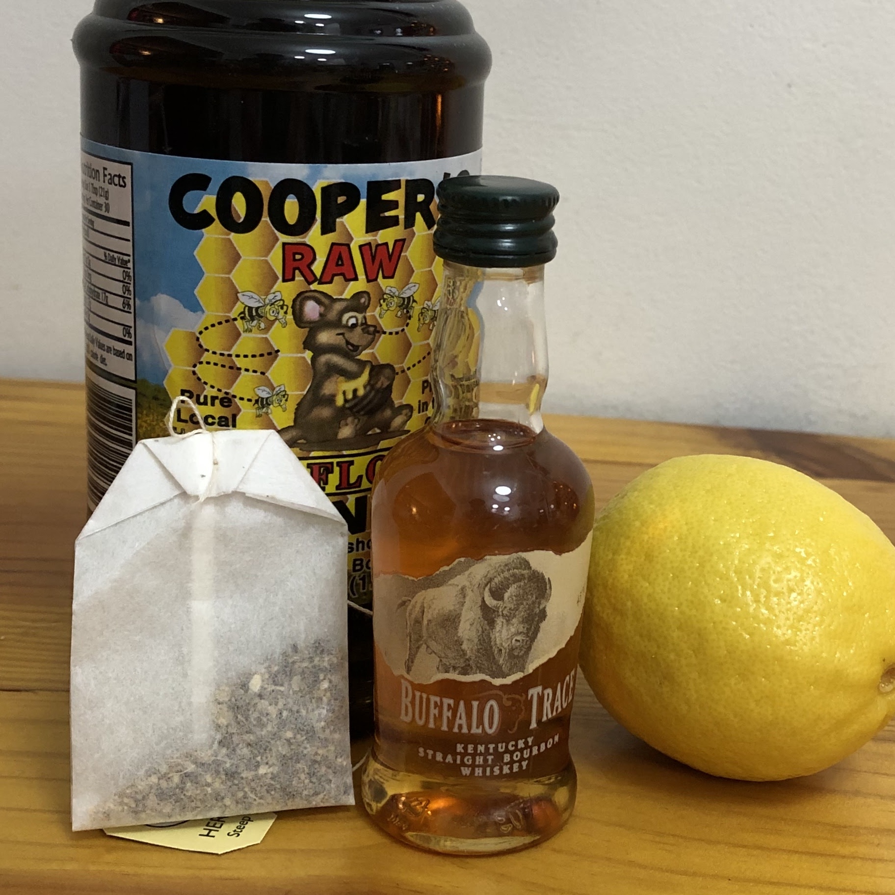 The ingredients for this Bourbon Hot Toddy are simple and likely to be in your kitchen. A tea bag of your choice (I used a lemon ginger tea), a bit of lemon juice, a squeeze of honey, a lot of bourbon and hot water. We rarely garnish with a lemon slice, but did here to make it pretty.