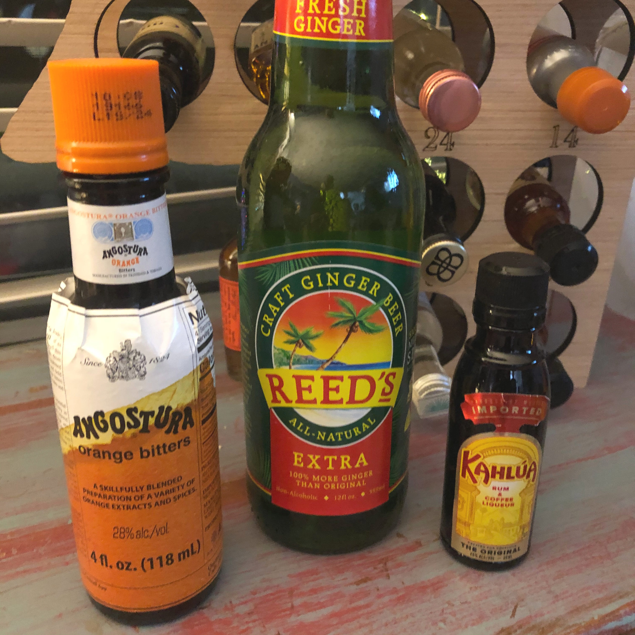 You’ll need just three ingredients, four if a garnish counts as an ingredient. Kahlua, ginger beer, orange bitters and an orange slice.
