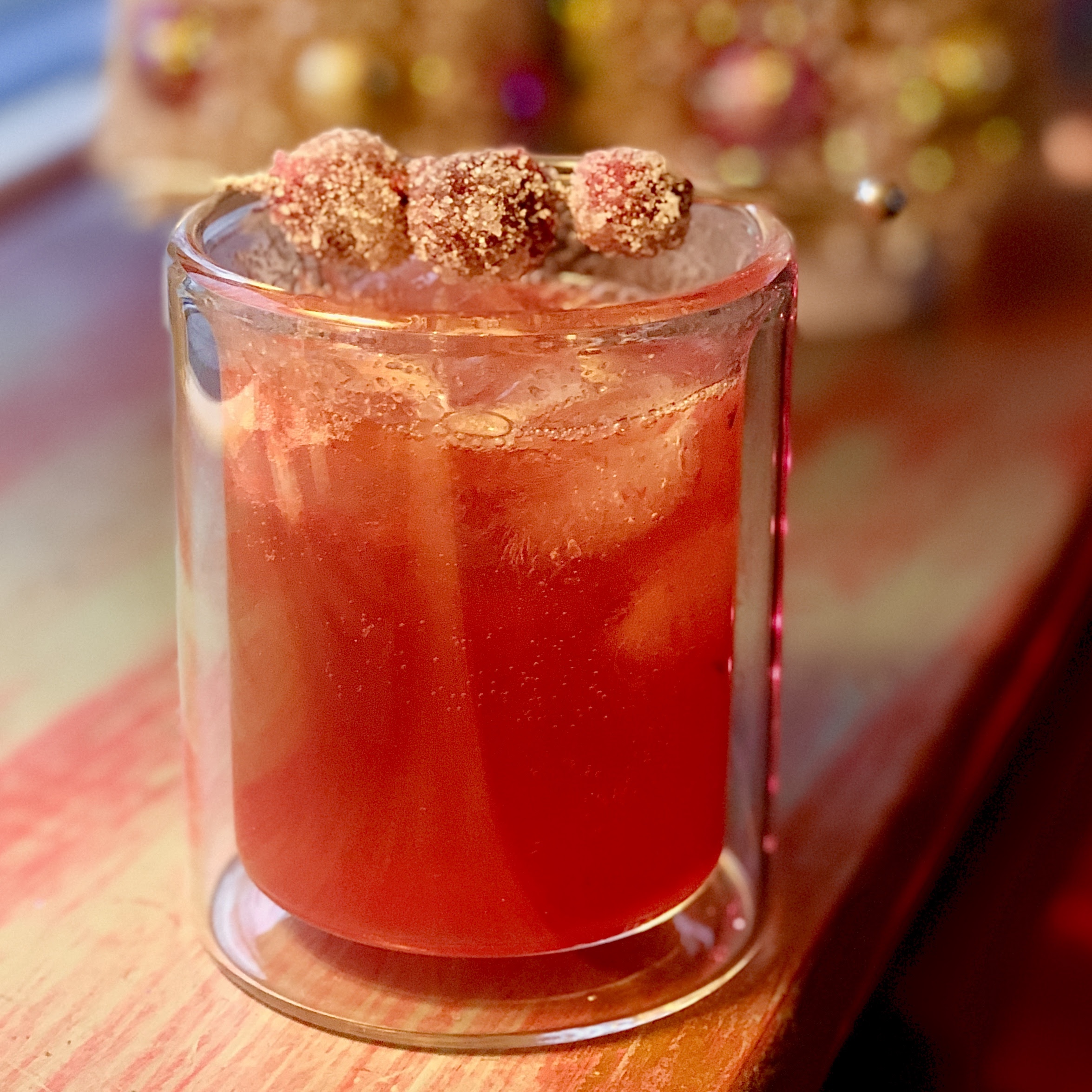 I sugared a handful of fresh cranberries to garnish this drink. The upswing from this: the leftover cranberry simple syrup I can use in drinks down the road. There are lengthy posts on the internet about sugaring cranberries, but it isn’t that hard. The lowdown is that you are making a simple syrup with equal parts sugar and water heated to just boiling, cool a bit, add cranberries and let them steep in the syrup for 10 minutes or so. Drain off syrup and reserve for future use. Toss the cranberries in a bowl of granulated sugar. You can save them for use a bit later, but if you keep them stored for too long the juice oozes out and you’ll have to toss in sugar again. I say just make enough for whatever you need them for right now.