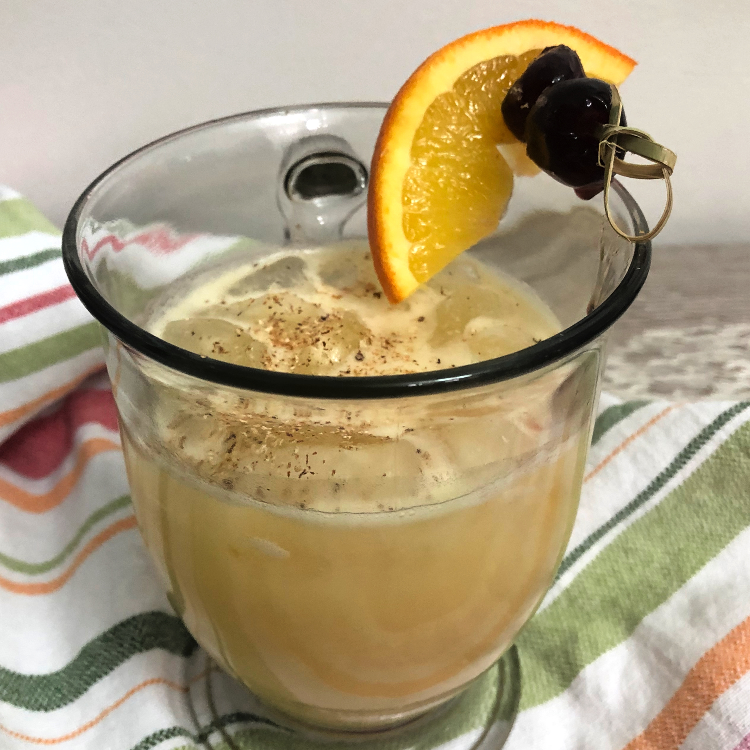 Top with fresh grated nutmeg. Garnish with Luxardo cherries and an orange wedge.