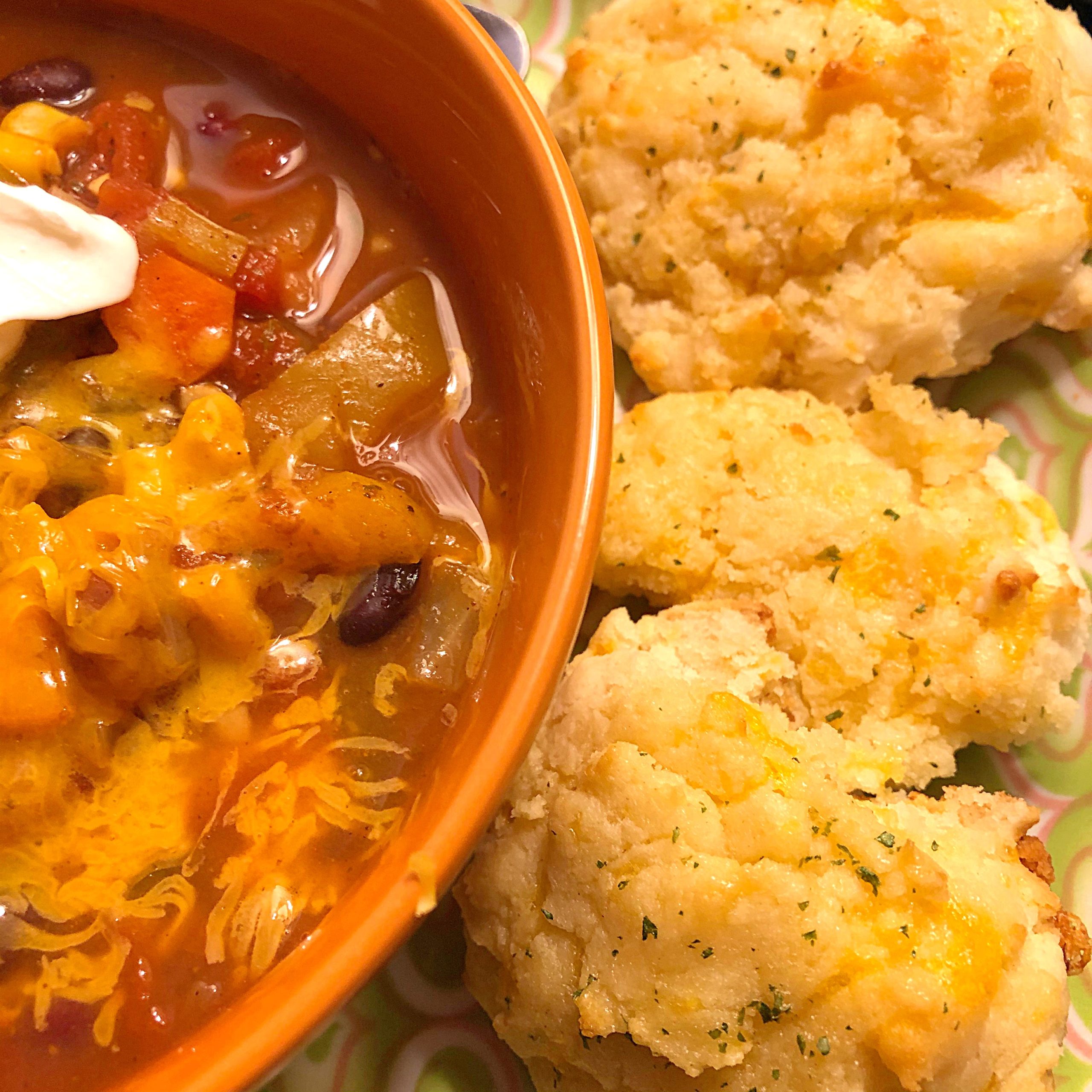 We make this vegetarian chili from GFE-Gluten Free Easily so often. I made this batch in the Instant Pot on a particularly cold and windy night. I saute the vegetables per the recipe, but do this in the Instant Pot using the saute feature. Then I cook the chili at 5 minutes Manual High Pressure and allow a 10 minute Natural Pressure Release with the “keep warm” light on. There will be a little pressure left to release. We had this with Red Lobster-style cheese biscuits. See below for more on that. I froze about half of the batch of chili to use another time.