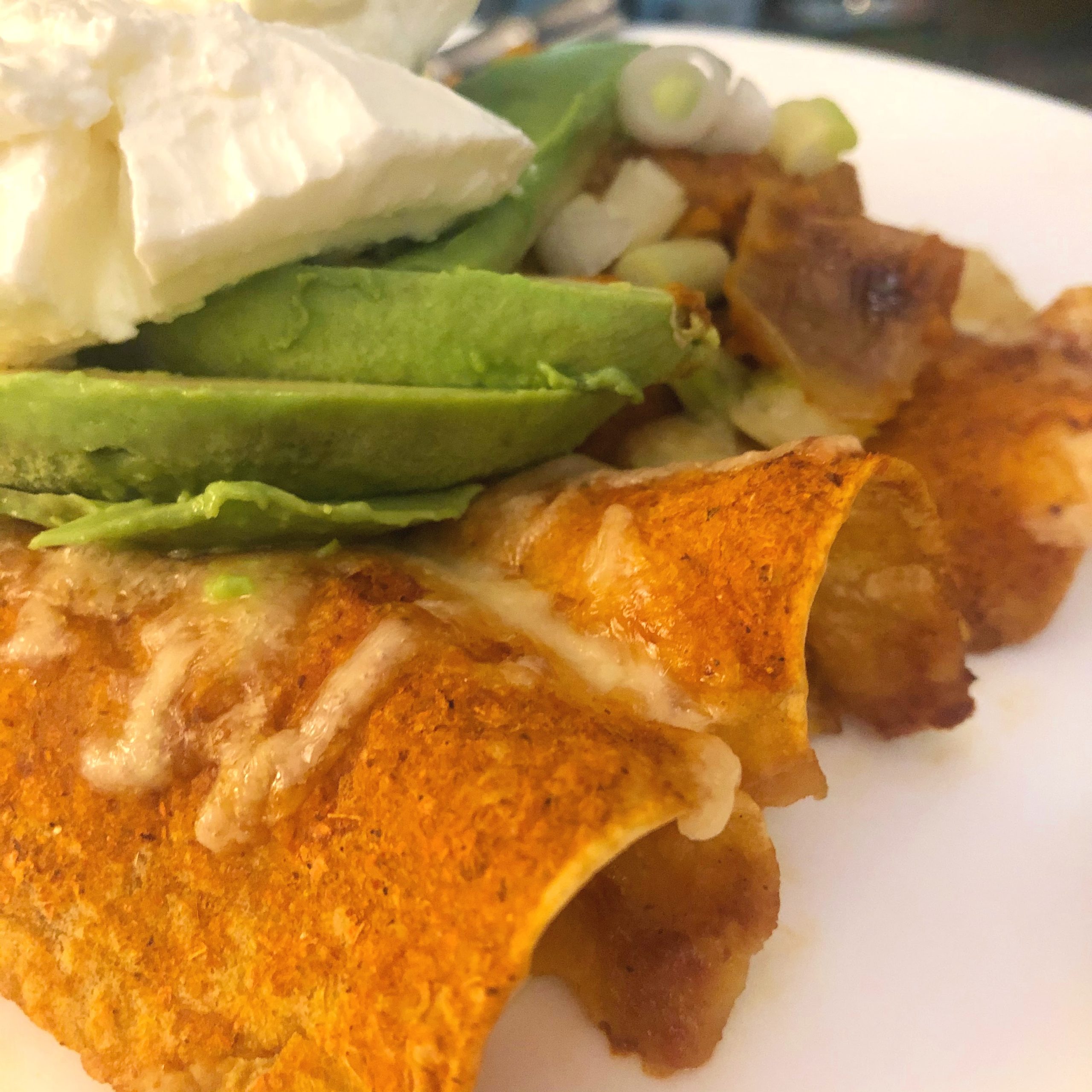 Enchiladas don’t have to be complicated or overwhelming. Truly it can be as simple as wrapping cheese and a sauteed onion in a tortilla, add sauce, bake. Drop a fried egg on top and you’ve got a fantastic meal. Often they are a fridge clean out meal. Here we’ve used sweet potatoes, onion, pepper and cheese. I like Monterey Jack best in enchiladas. Be sure to check your sauce for gluten if that is a concern. Not all canned enchilada sauces are gluten-free. It’s a great time to make your own, if that interests you. It’s so easy!