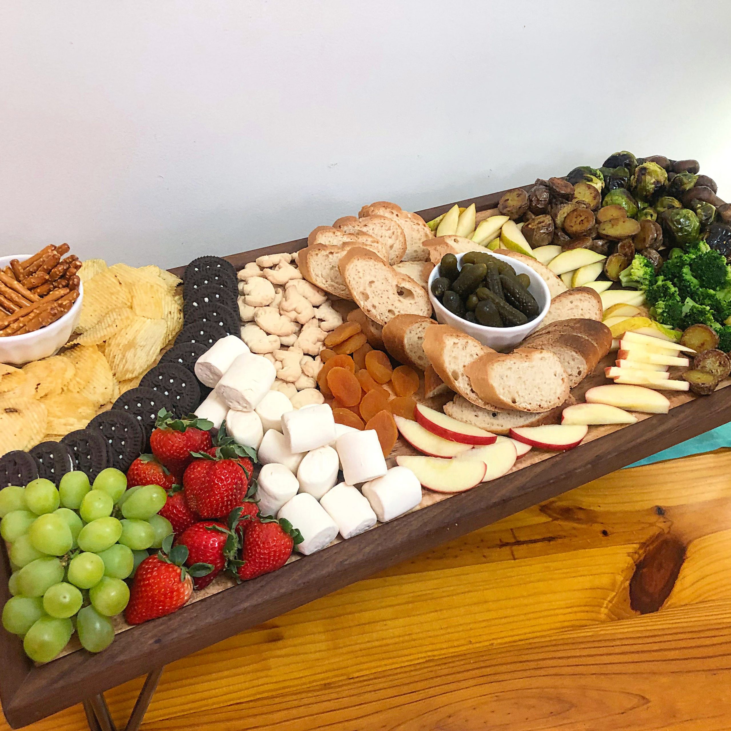 First up, you’ll need to choose a board. I’ve used a custom made graze board created by Boda Woodworks. I gave Bill the dimensions I had in mind and had hairpin legs from Modern Urban Metals shipped directly to him. The legs give the board just enough height to make it perfect for sharing a graze on the sofa, a coffee table or ottoman but my favorite use is on our small kitchen table. Elevating the graze gives us more space for beverages, dips, fondue and such. This board is crafted of walnut and birdseye maple and has a light food-safe finish. Always make sure anything you are using for a graze board is food-safe.