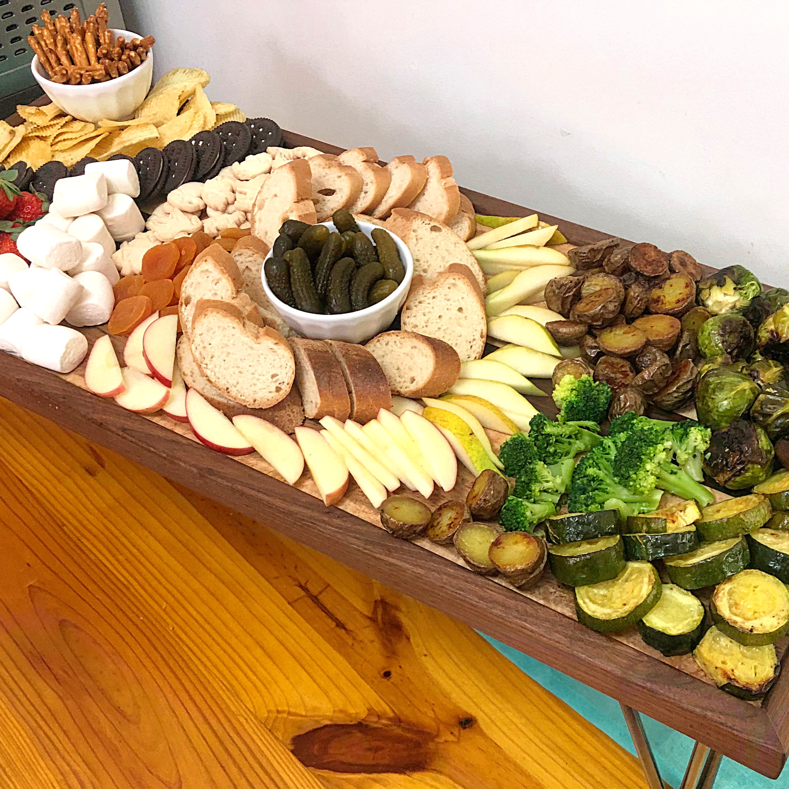 Wow! What a spread! So much fun and such delicious options! That grazing board is beautiful and so functional, especially with those legs. I like the bean can warmers, too!